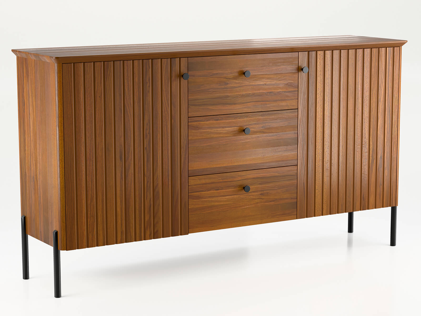 Wyjątkowa Lekkość - Kluczowym elementem konstrukcji są czarne, metalowe nogi, które zapewniają stabilność, a jednocześnie dzięki swojej smukłości i wysokości nadają całej bryle mebla wizualnej lekkości. Efekt "unoszenia się nad ziemią" sprawia, że komoda wygląda subtelnie i nowocześnie, nawet w mniejszych przestrzeniach. To gra kontrastów, która dodaje aranżacji głębi i charakteru.