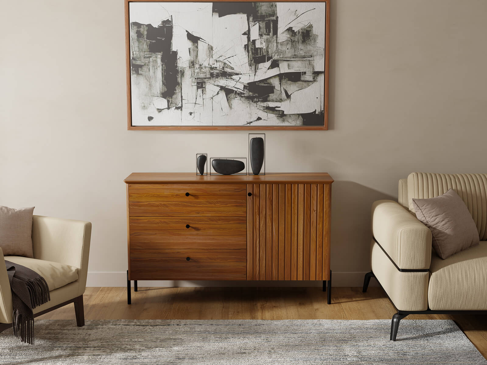 Uniwersalny Design - Komoda Lamelo doskonale odnajduje się zarówno w salonie, sypialni, jak i przedpokoju czy gabinecie. Jej harmonijna forma oraz wysmakowane detale sprawiają, że z łatwością dopasowuje się do różnych stylów wnętrzarskich – od skandynawskiej prostoty, przez loftową surowość, aż po klasyczną elegancję. To mebel, który zawsze wygląda dobrze – niezależnie od otoczenia.