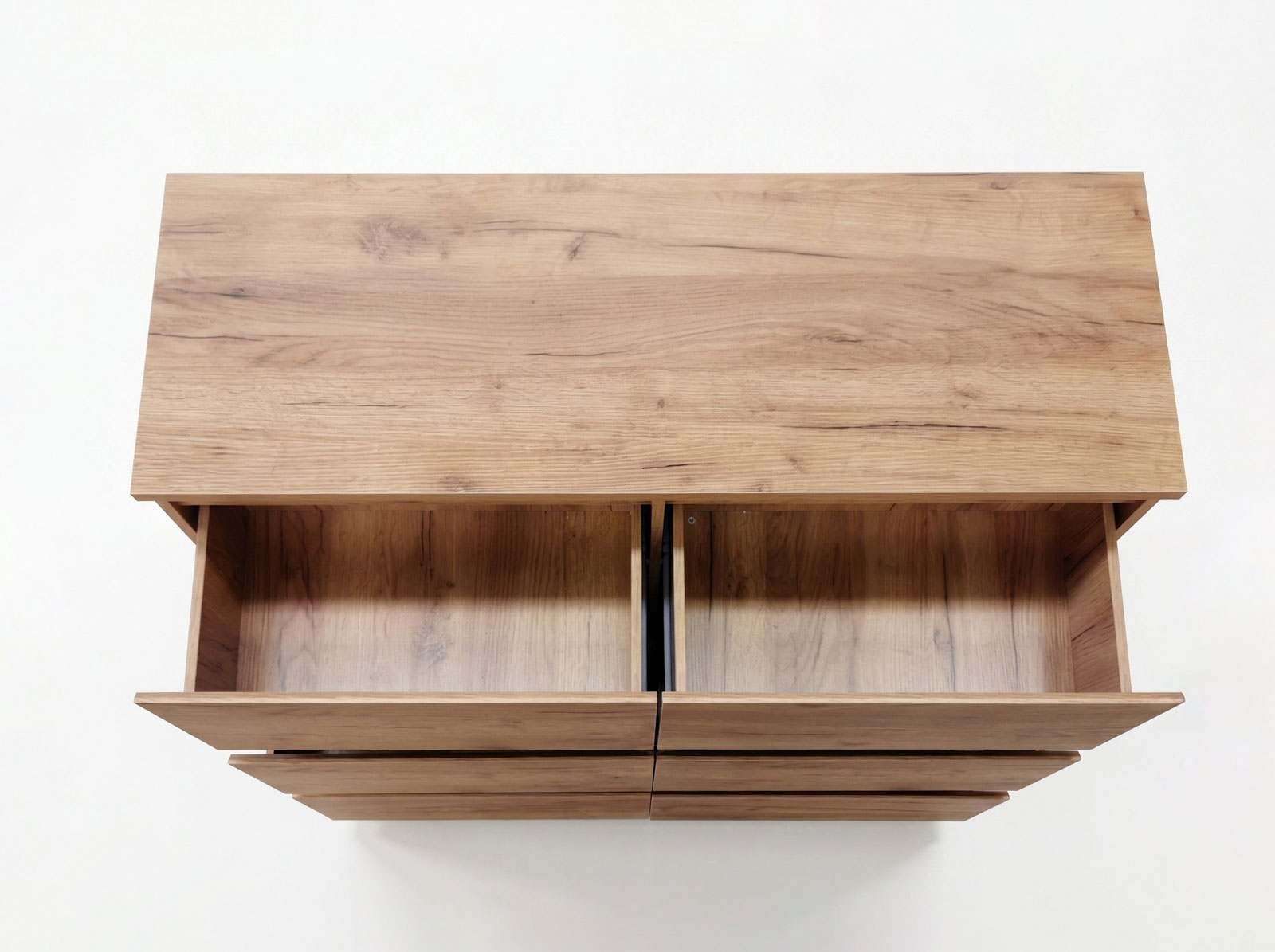 Mebel został wykonany z wysokiej jakości płyty meblowej, co gwarantuje trwałość i komfort codziennego użytkowania. Wzmocniony tył komody zwiększa stabilność konstrukcji i wpływa na jej długą żywotność. Gładkie fronty szuflad są nie tylko estetyczne, ale także łatwe w utrzymaniu czystości.