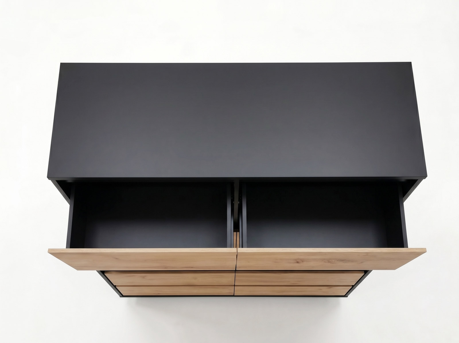Minimalistyczna forma, prosta bryła oraz brak uchwytów nadają meblowi elegancki i nowoczesny charakter. Komoda nowoczesna Fabio inspirowana jest aktualnymi trendami wnętrzarskimi, a jej uniwersalny wygląd sprawia, że z łatwością dopasujesz ją do różnych aranżacji – od stylu skandynawskiego po loftowy. Naturalny dekor drewna dodatkowo ociepla przestrzeń i nadaje jej przytulności.
