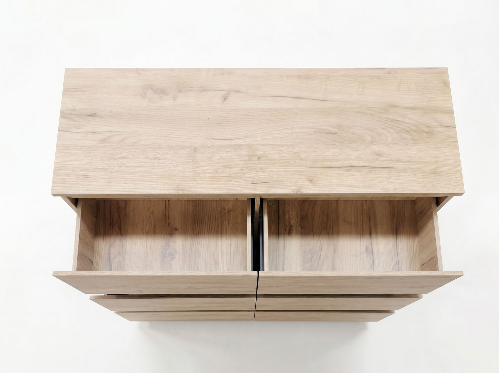 Mebel został wykonany z wysokiej jakości płyty meblowej, co gwarantuje trwałość i komfort codziennego użytkowania. Wzmocniony tył komody zwiększa stabilność konstrukcji i wpływa na jej długą żywotność. Gładkie fronty szuflad są nie tylko estetyczne, ale także łatwe w utrzymaniu czystości.