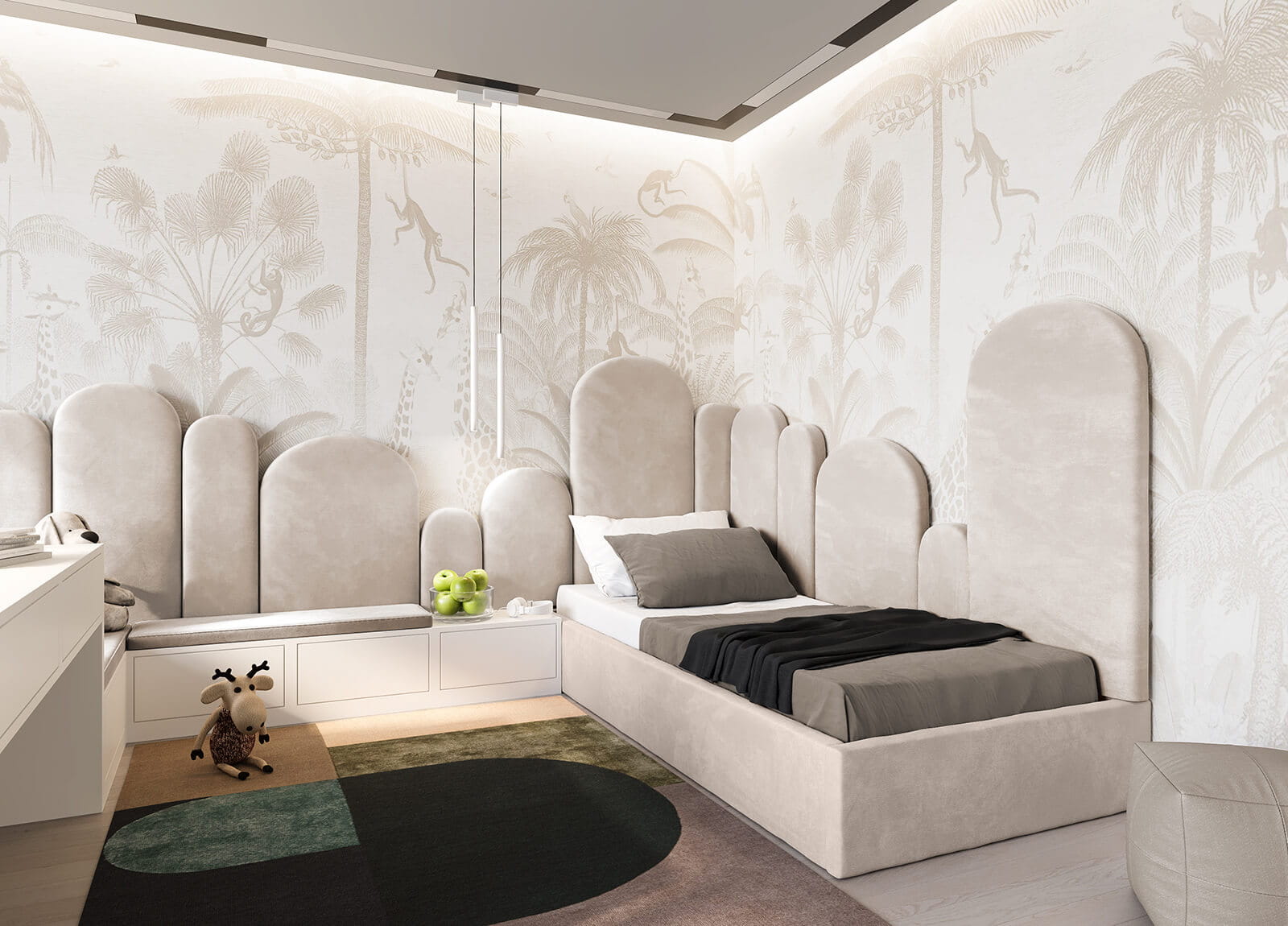 Łóżko wyposażone jest w stelaż z elastycznych brzozowych listew, osadzony na solidnej metalowej ramie, co zapewnia doskonałe podparcie na całej powierzchni. Wbudowany pojemnik na pościel pod łóżkiem pozwala na optymalne wykorzystanie przestrzeni w pokoju. Miękka velvetowa tapicerka oraz brak ostrych krawędzi sprawiają, że Twój maluch będzie czuł się komfortowo i bezpiecznie podczas snu.