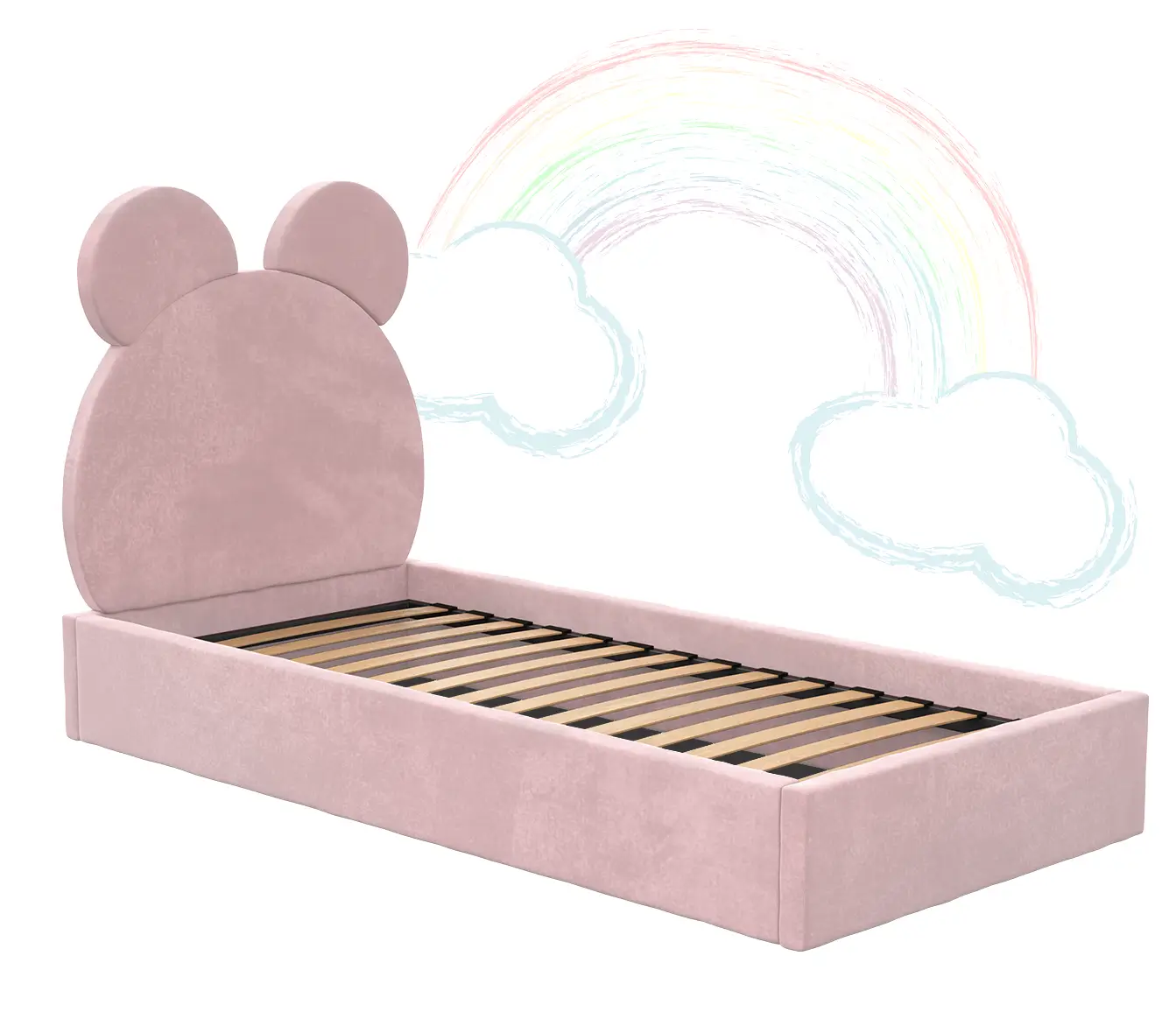 Łóżko posiada stelaż z elastycznych listew brzozowych, osadzony na solidnej metalowej ramie, co zapewnia równomierne podparcie. Jednym z ważniejszych elementów jest wbudowany pojemnik do przechowywania pod łóżkiem, który pozwoli na ergonomiczne wykorzystanie przestrzeni. Miękki w dotyku materiał welwetowy oraz brak ostrych krawędzi sprawiają, że sen Twojego malucha będzie nie tylko spokojny, ale również przyjemny.