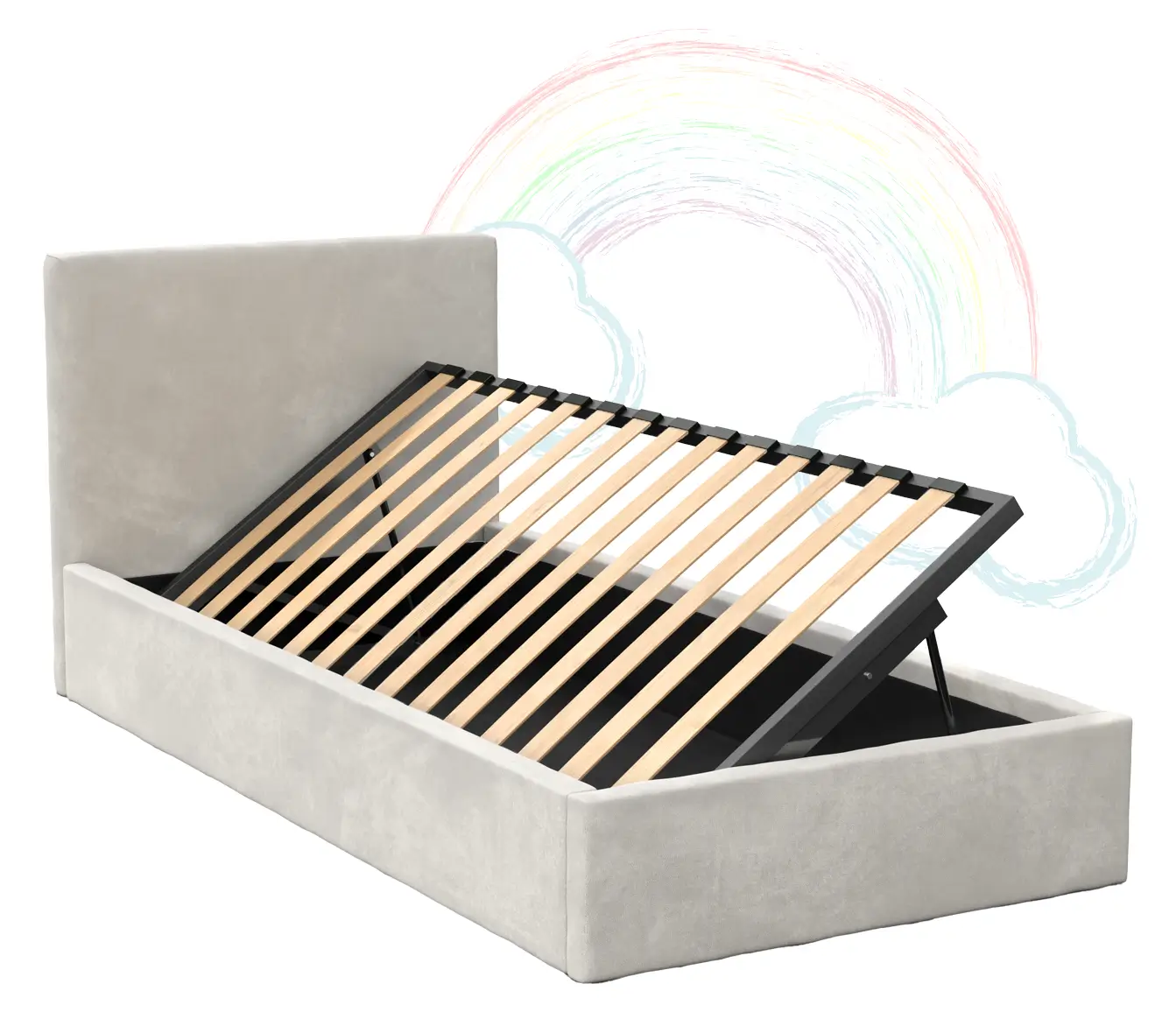 Łóżko wyposażone jest w stelaż z elastycznych brzozowych listew, osadzony na solidnej metalowej ramie, co zapewnia doskonałe podparcie na całej powierzchni. Wbudowany pojemnik na pościel pod łóżkiem pozwala na optymalne wykorzystanie przestrzeni w pokoju. Miękka velvetowa tapicerka oraz brak ostrych krawędzi sprawiają, że Twój maluch będzie czuł się komfortowo i bezpiecznie podczas snu.