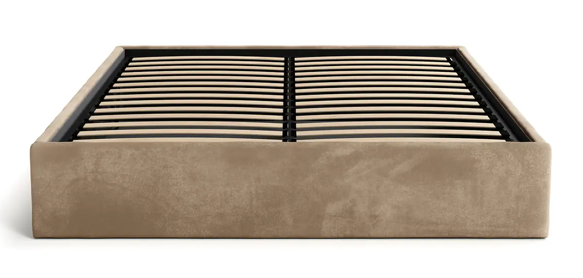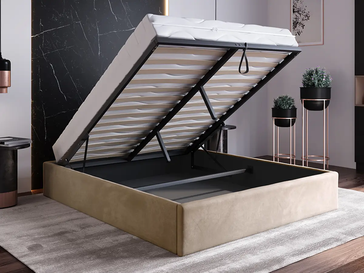 Nasze nowoczesne łóżko tapicerowane bez zagłówka z podnoszonym stelażem elastycznym to wyjątkowe połączenie funkcjonalności i nowoczesnego designu. Jedną z jego kluczowych cech jest solidna metalowa rama, na której osadzony jest stelaż 2x14 listewkowy, podnoszony za pomocą podnośników gazowych. Dzięki temu rozwiązaniu podnoszenie stelaża jest niezwykle łatwe i bezpieczne, co znacząco ułatwia dostęp do przestronnego pojemnika na pościel. To idealne rozwiązanie dla osób ceniących sobie wygodę i nowoczesne technologie w swoim domu.