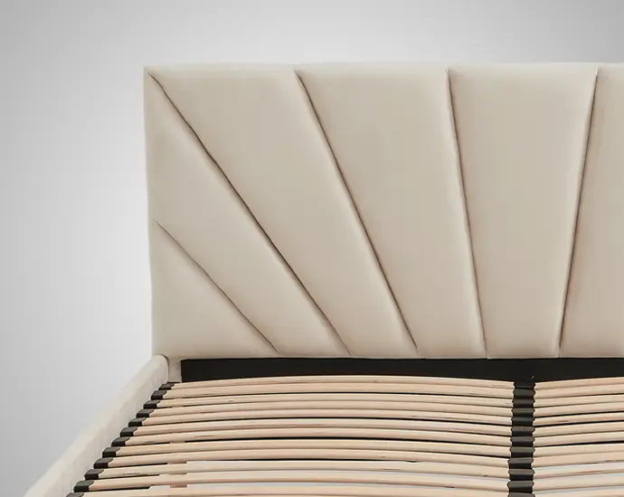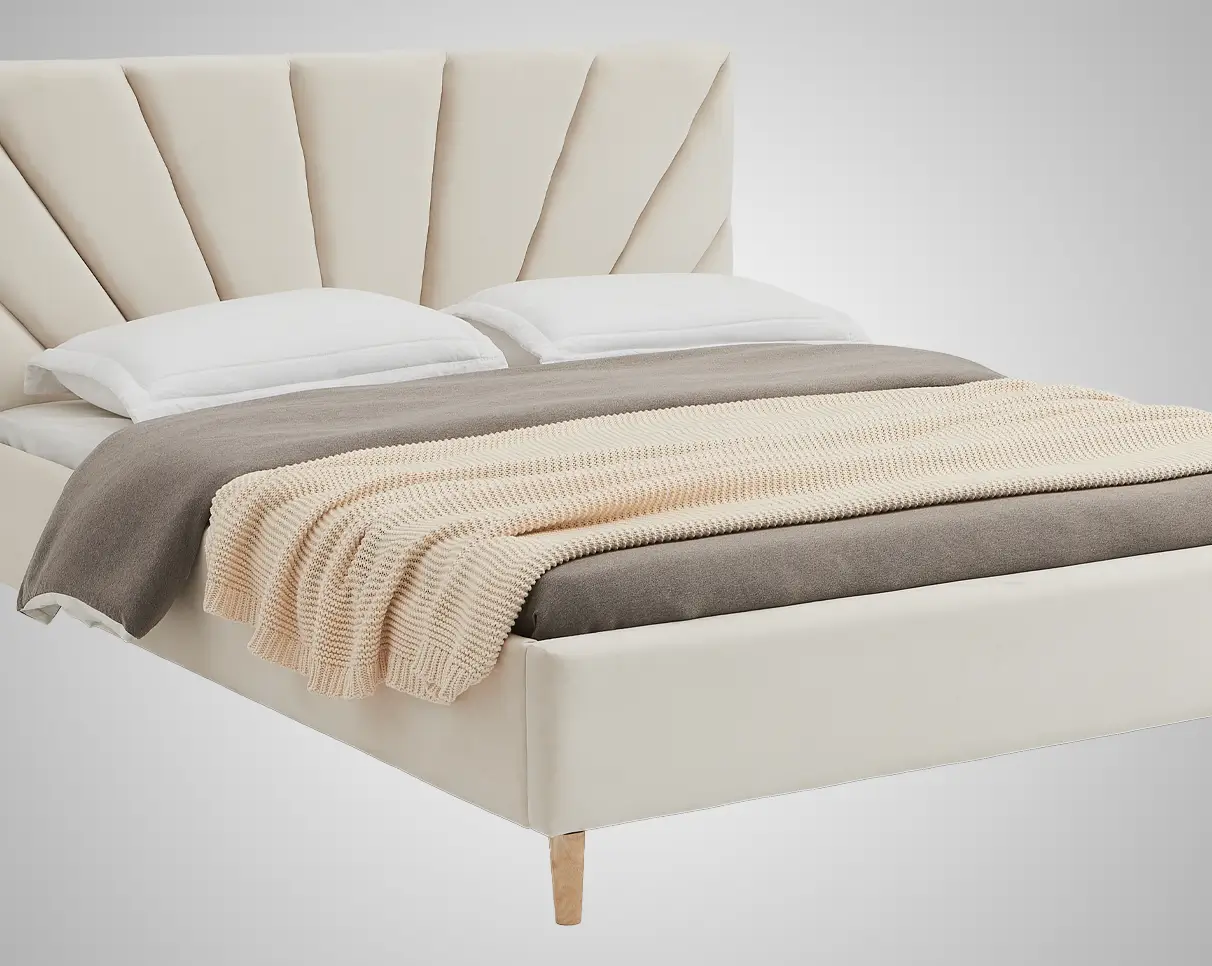 Tkanina welurowa nie tylko nadaje łóżku elegancji, ale także dostarcza miękkiego i przyjemnego dotyku. Przeszycia w formie wachlarza na zagłówku dodają mu wyjątkowego uroku.