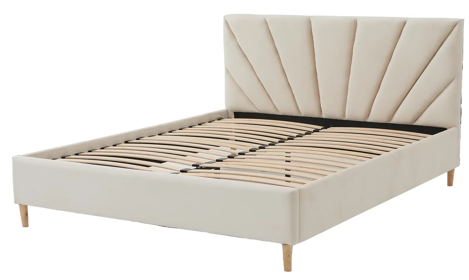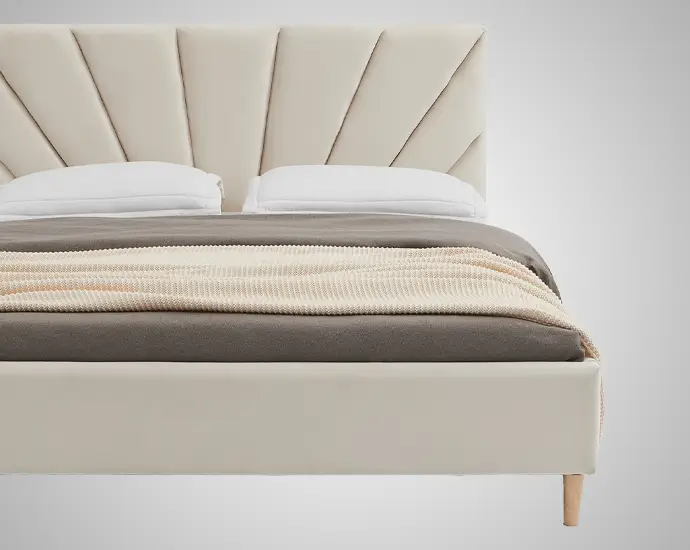 Welurowa tkanina obiciowa to nie tylko estetyczny wybór, ale przede wszystkim gwarancja miękkości i wyjątkowej elegancji. Kolor mebla doskonale komponuje się z różnymi aranżacjami wnętrz, a przeszycia w zagłówku w formie wachlarza nadają dodatkowego charakteru temu łóżku. Dodatkowo drewniane nogi łóżka w jasnym odcieniu subtelnie podkreślają jego niepowtarzalny styl.