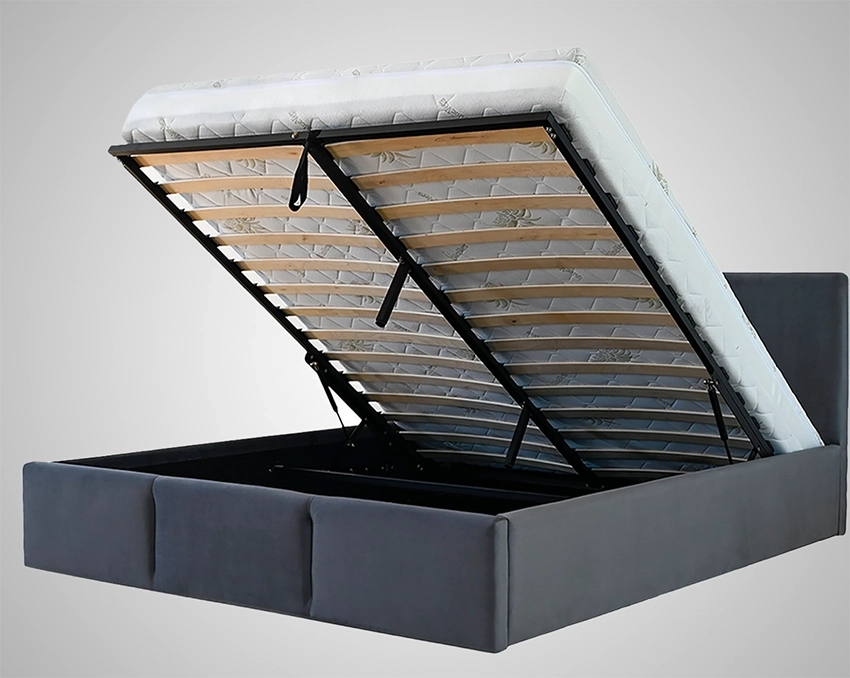 Wbudowany stelaż na podnośnikach gazowych o mocy 80 N z pojemnikiem na pościel sprawia, że utrzymanie porządku w sypialni staje się łatwe i efektywne.