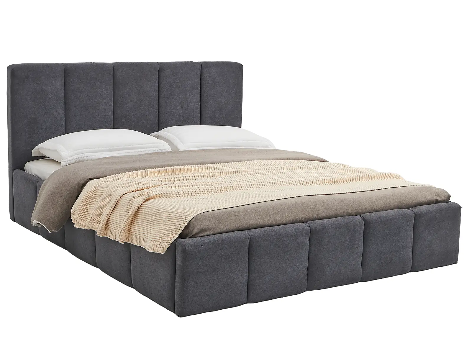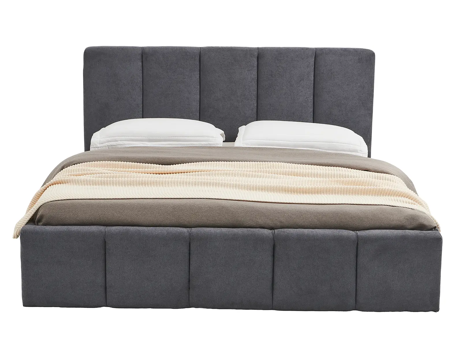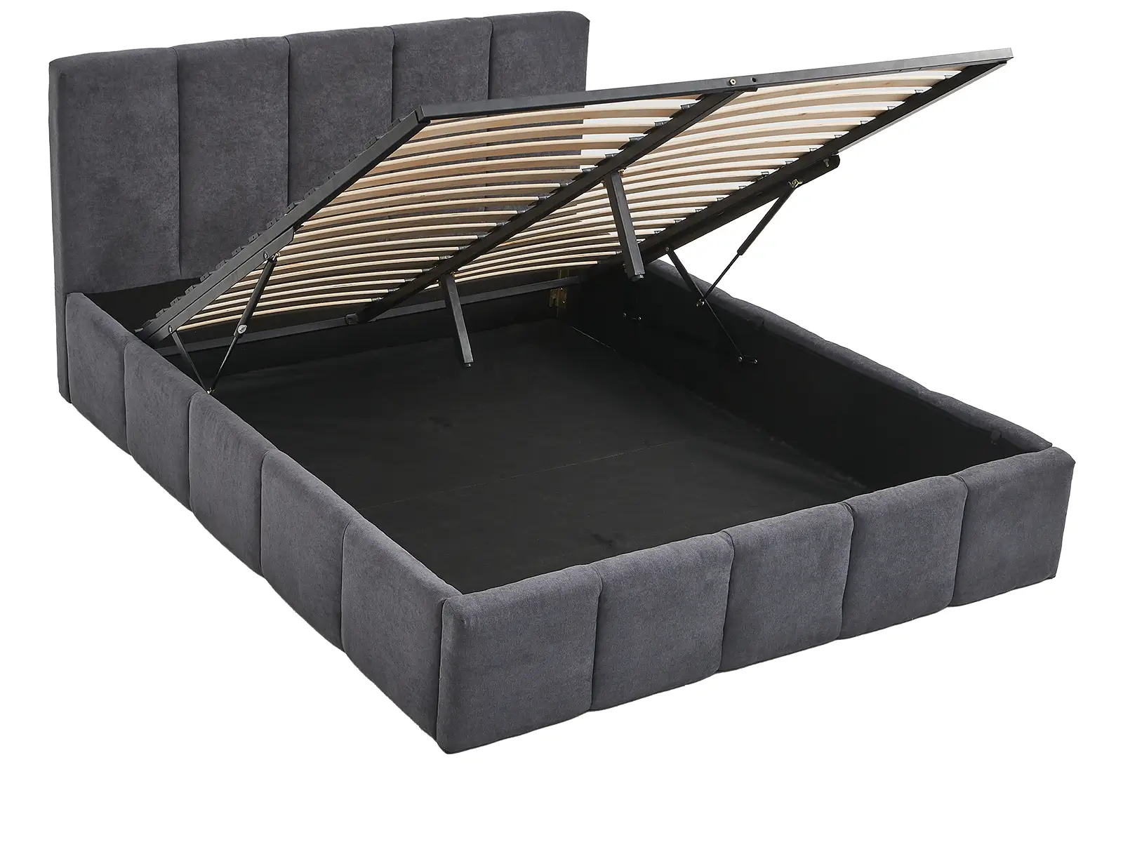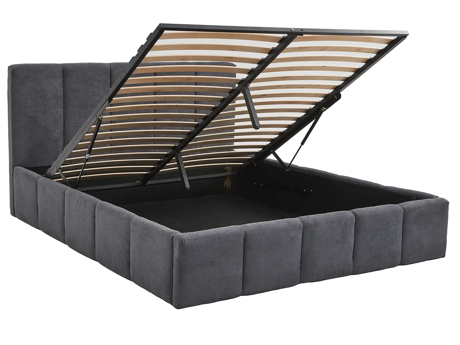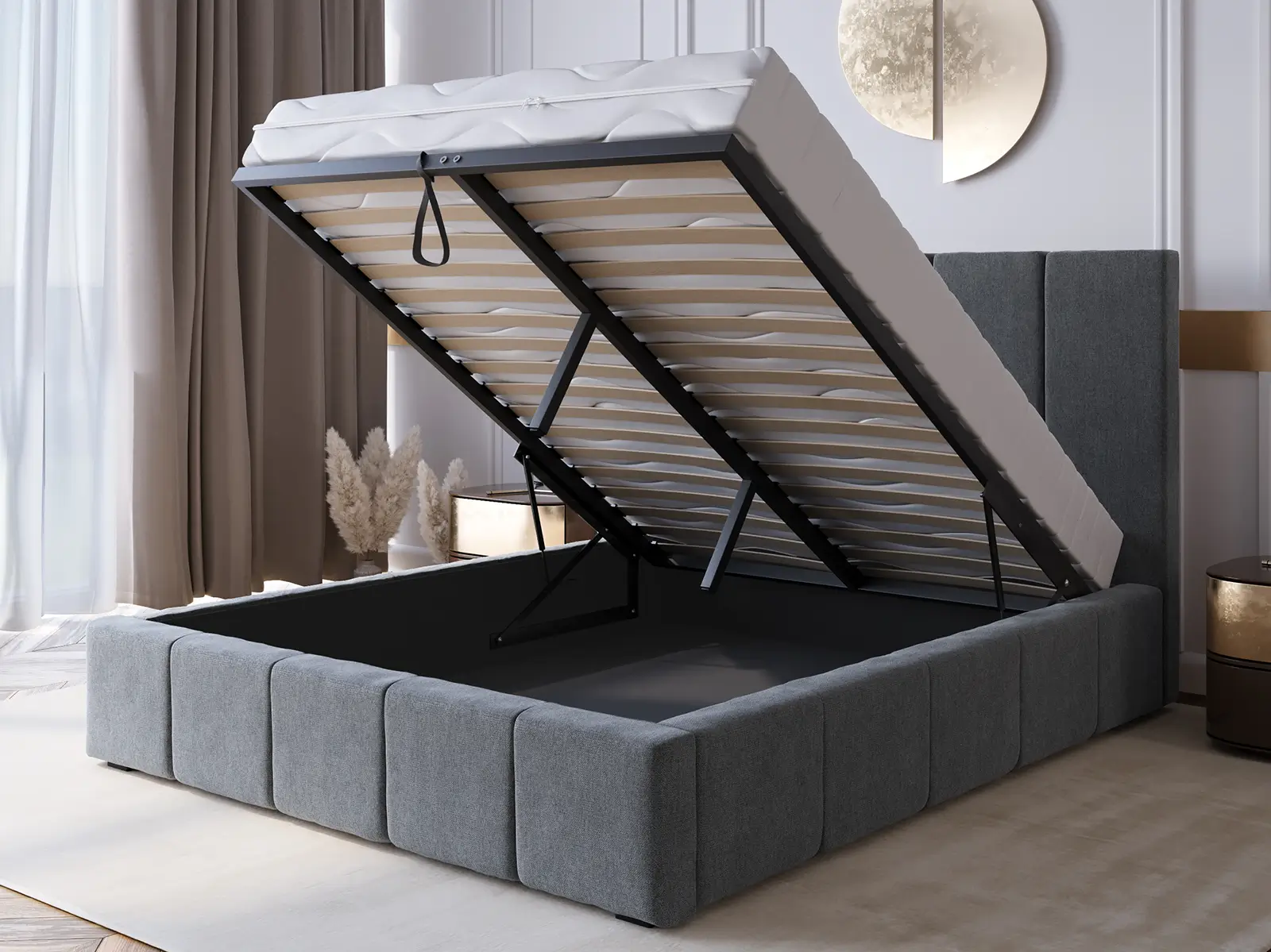 Wbudowany stelaż na podnośnikach gazowych o mocy 80 N z pojemnikiem na pościel sprawia, że utrzymanie porządku w sypialni staje się łatwe i efektywne.