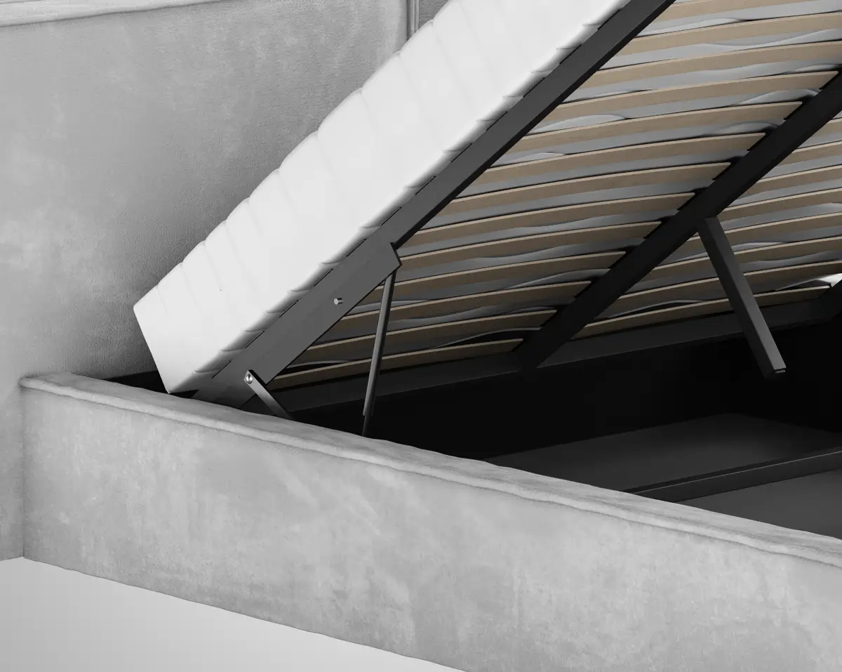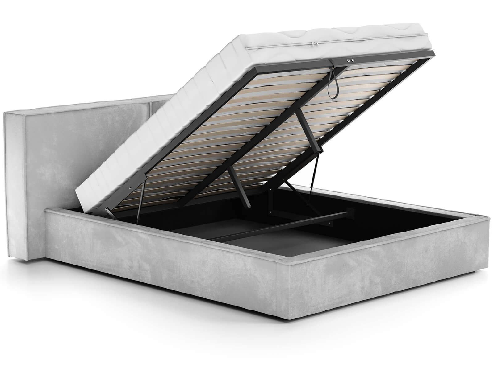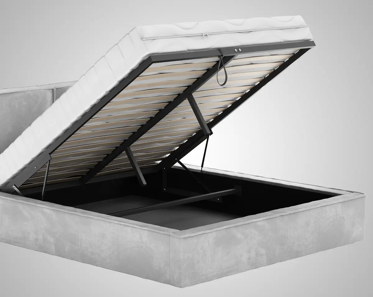 Wbudowany stelaż na podnośnikach gazowych o mocy 70N z pojemnikiem na pościel sprawia, że utrzymanie porządku w sypialni staje się łatwe i efektywne.