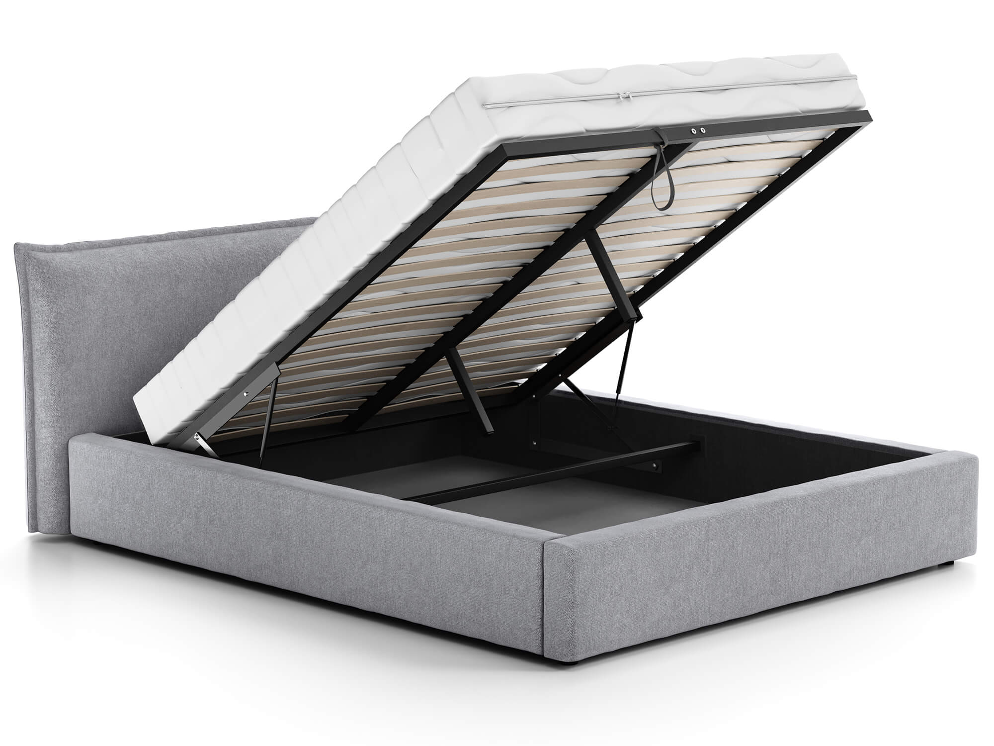 Wbudowany stelaż na podnośnikach gazowych o mocy 70N z pojemnikiem na pościel sprawia, że utrzymanie porządku w sypialni staje się łatwe i efektywne.