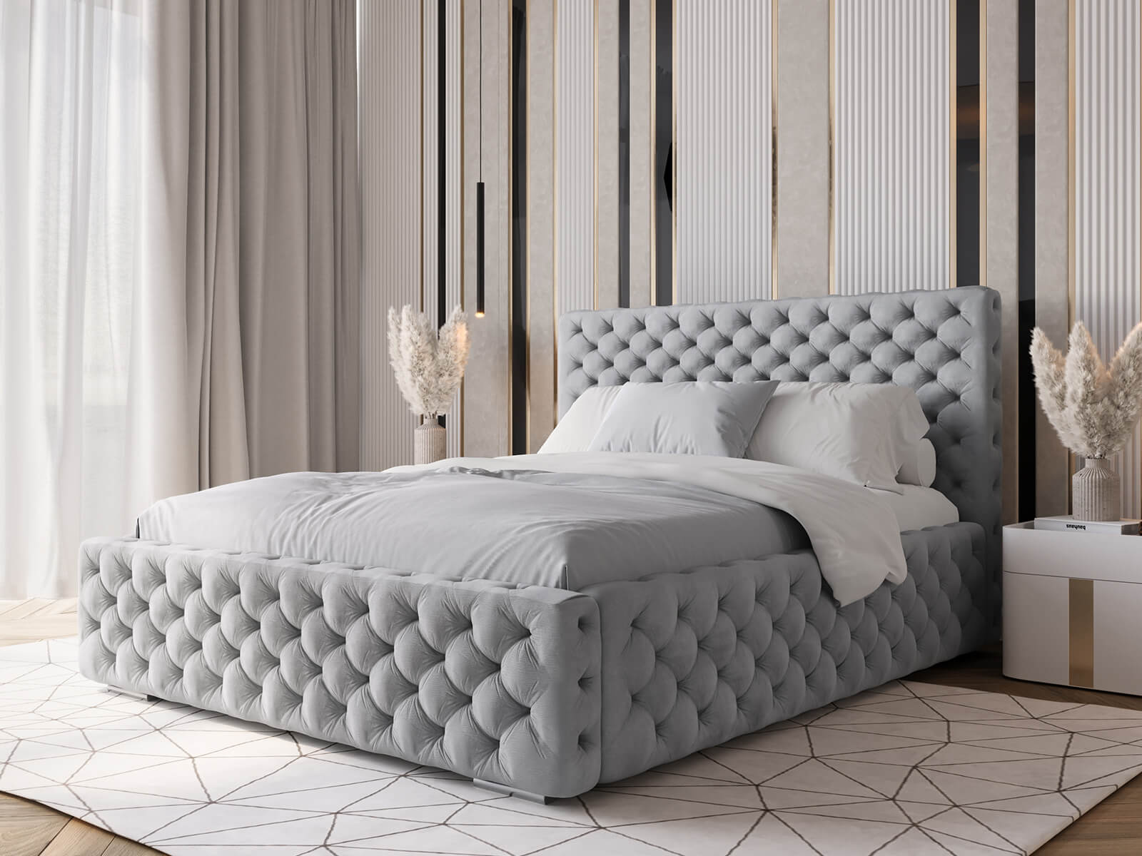 Miękka tkanina welwetowa z głębokimi pikami dodają łóżku unikalnego charakteru, tworząc efektowny mebel, który wyróżnia się w każdej aranżacji.