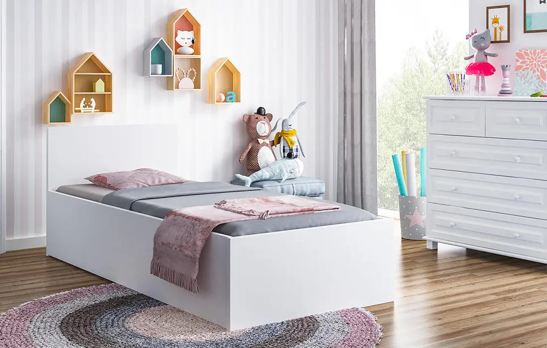 Trwałość i stabilność: Wykonane z wysokiej jakości płyty meblowej, łóżko DM1 zapewnia solidną konstrukcję, odporną na codzienne użytkowanie, a stabilność gwarantuje bezpieczne i komfortowe korzystanie.