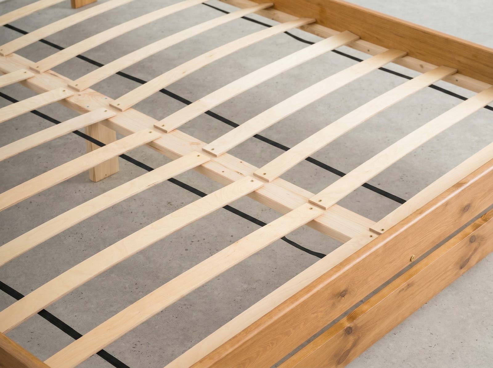 Stelaż w zestawie: Składa się z dwunastu elastycznych listewek wykonanych z wysokiej jakości drewna, które są starannie rozmieszczone, aby równomiernie rozkładać ciężar ciała i minimalizować ryzyko niewłaściwego ułożenia kręgosłupa.