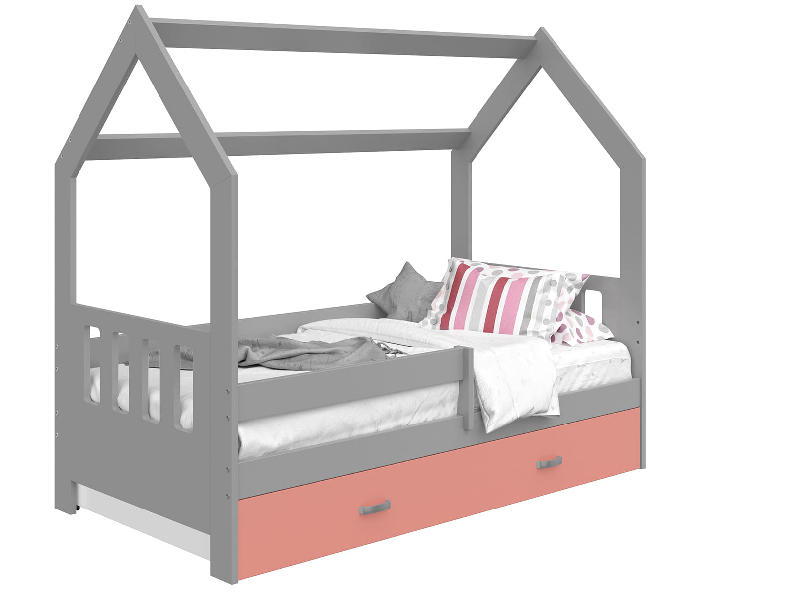 Łóżeczko Montessori w kształcie domku to spełnienie marzeń dziecka. Mebel wykonany w kształt tej konstrukcji pobudzi kreatywność Waszej pociechy. Łóżko Domek jest stabilne i wytrzymałe, dzięki czemu posłuży na dłużej. Barierka załączona do zestawu zabezpieczy malucha przed upadkiem. Pod łóżkiem jest wystarczająco miejsca, aby zmieścić szufladę – można ją dodatkowo dokupić, konfigurując produkt. Model D3C występuje na naszej stronie w czterech wersjach kolorystycznych, dzięki czemu można z łatwością dopasować go większości wnętrz. Łóżko wykonane jest z drewna, a blaty posiadający nacięcia z płyty MDF. Łóżko Domek będzie idealnym miejscem zarówno do twórczej zabawy, jak i do odpoczynku po całym dniu. Domek D3C szary znakomicie wkomponuje się do pokoju dziecięcego jako łóżko dla dziewczynki i łóżko dla chłopca.