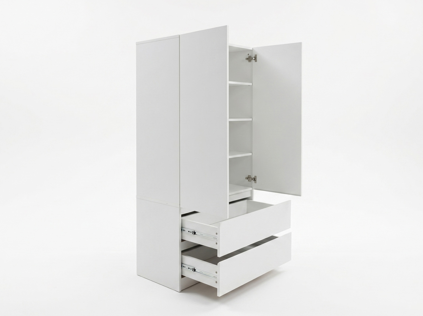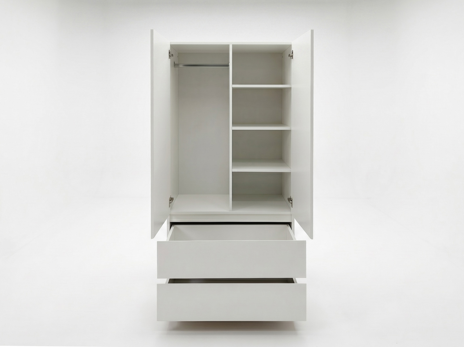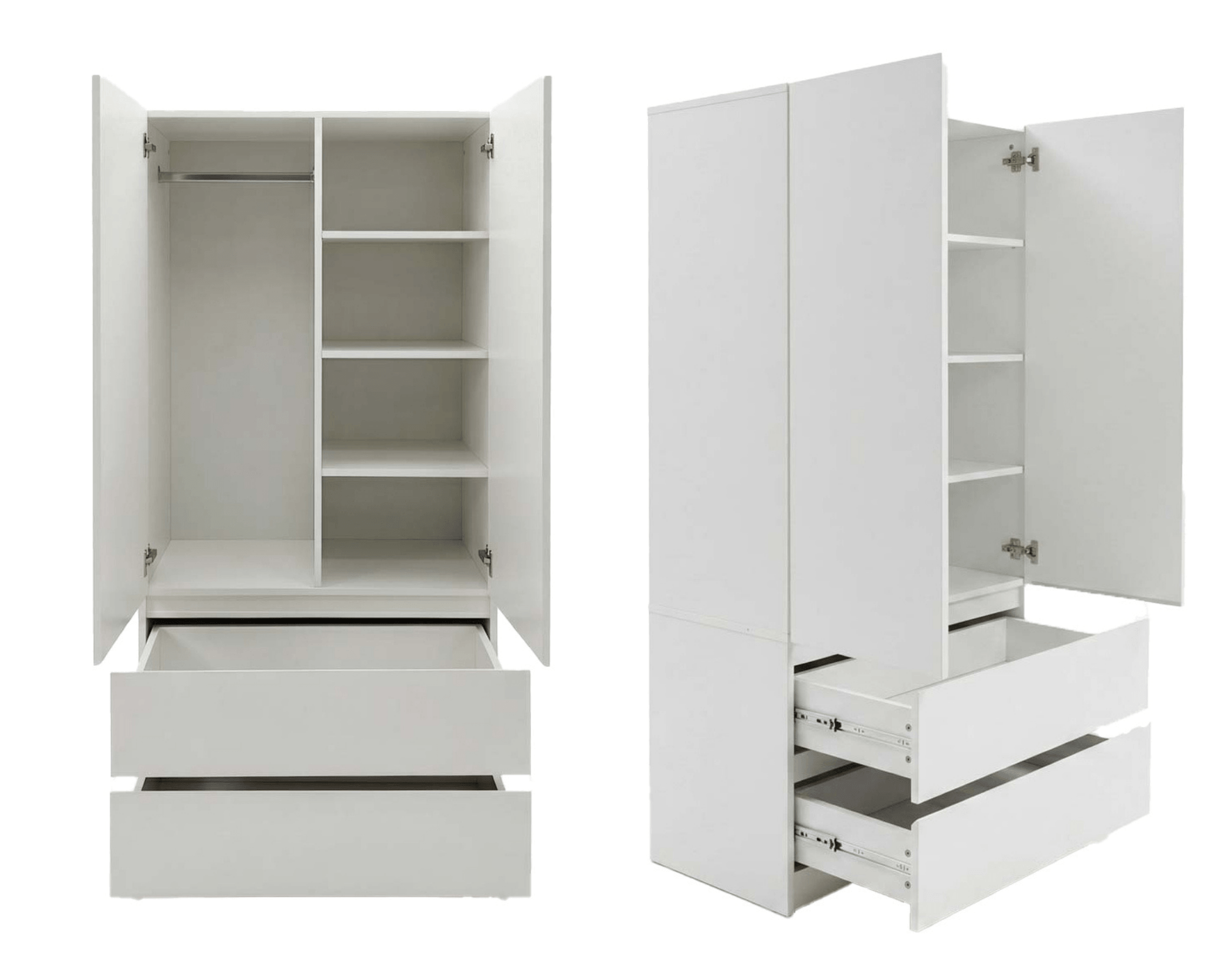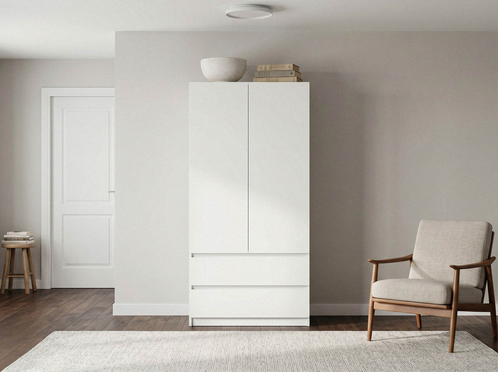 Wnętrze szafy oferuje drążek na wieszaki, idealny do przechowywania koszul, kurtek czy sukienek, a także praktyczne półki, które ułatwiają segregację ubrań i dodatków. Dodatkowo 2 pojemne szuflady pozwalają na wygodne przechowywanie mniejszych elementów garderoby, pomagając utrzymać porządek.
