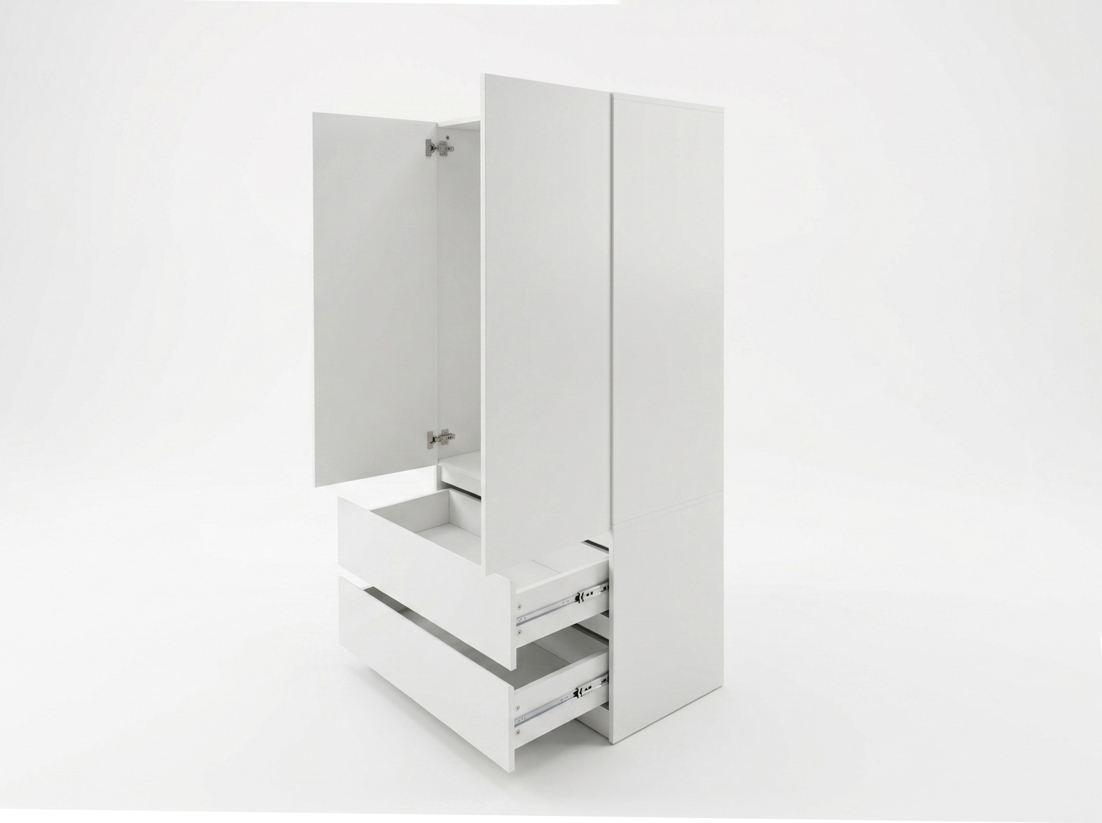 Mebel wykonany został z wysokiej jakości płyty meblowej, co zapewnia trwałość oraz odporność na codzienne użytkowanie. Gładkie fronty podkreślają estetykę i są łatwe w utrzymaniu czystości, a solidna konstrukcja gwarantuje długą żywotność.