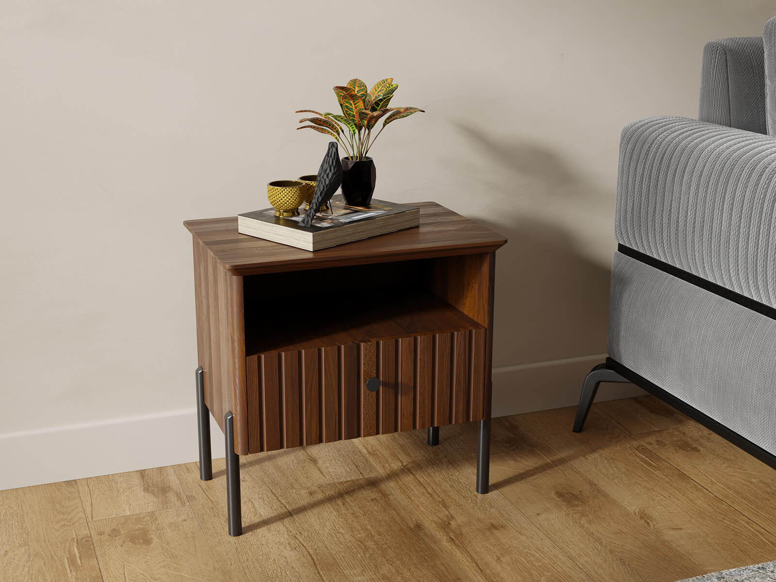 Uniwersalny Design - Szafka nocna Lamelo doskonale komponuje się zarówno z nowoczesnymi, minimalistycznymi sypialniami, jak i z wnętrzami w stylu klasycznym, skandynawskim czy loftowym. Jej ponadczasowa forma i dekoracyjne detale sprawiają, że harmonijnie uzupełnia różnorodne aranżacje, dodając im elegancji i wyrafinowanego charakteru.