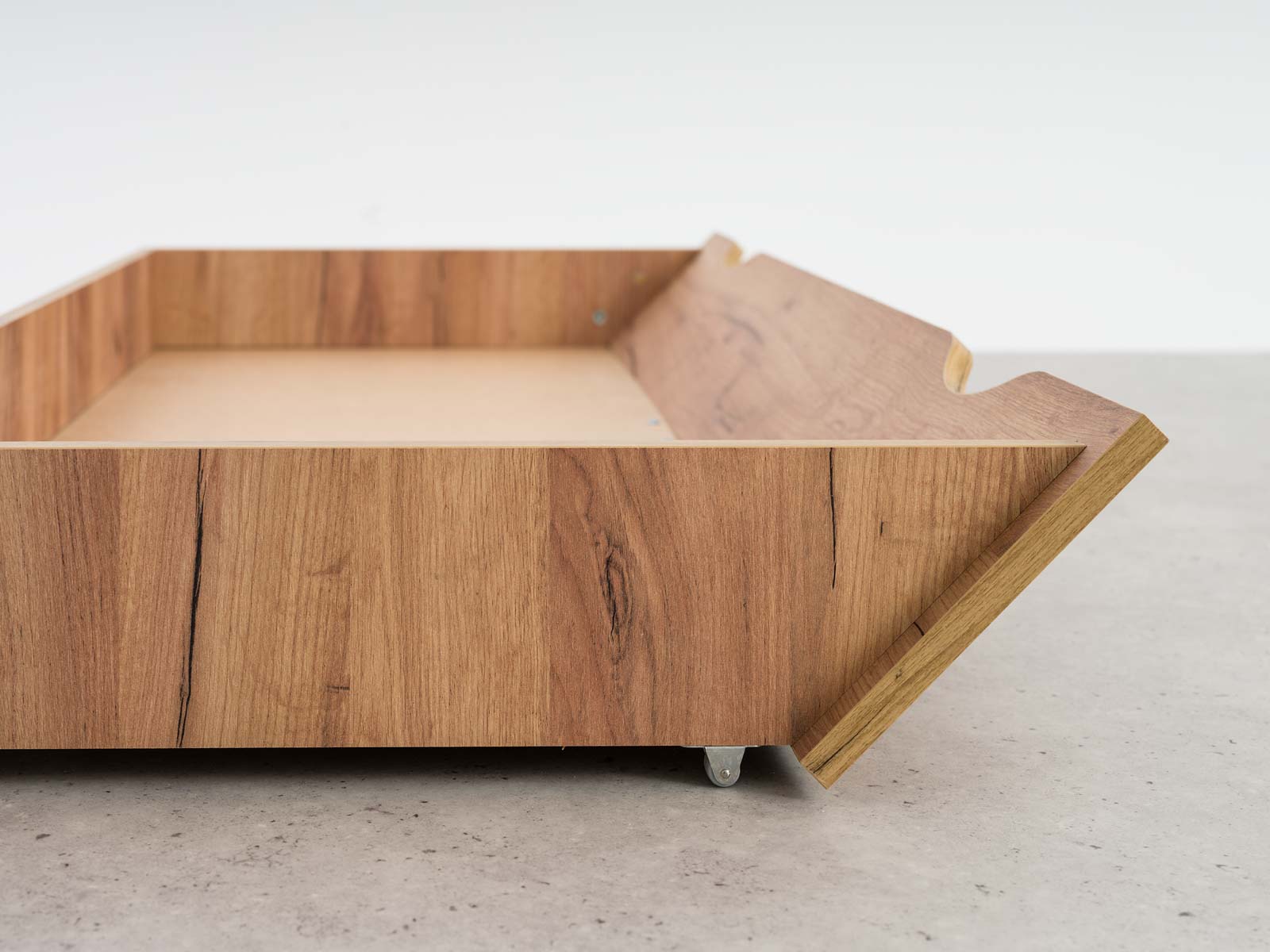 Szuflada pod łóżko DM2 została wykonana z trwałej płyty meblowej, a jej estetyczne wykończenie idealnie komponuje się z designem łóżka DM2. Wymiary szuflady: wysokość boków 14 cm (plus kółka), głębokość boków 64 cm u góry i 50 cm u dołu, długość frontu 144,1 cm, długość tylnej ścianki 137,6 cm – zapewniają dużą pojemność i pełną funkcjonalność, bez zaburzania nowoczesnej formy łóżka.