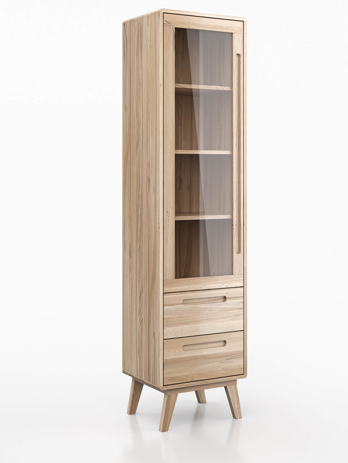 Charakterystyczną cechą witryny są skośne nogi, nadające całej bryle mebla unikatowego charakteru. Dodatkowo, frezowane uchwyty frontów ułatwiają korzystanie z witryny i dodają jej wyjątkowego wyglądu. Warstwa bezbarwnego lakieru pełni rolę ważnego zabezpieczenia, chroniąc powierzchnię mebla i podkreślając jego naturalne piękno drewna.